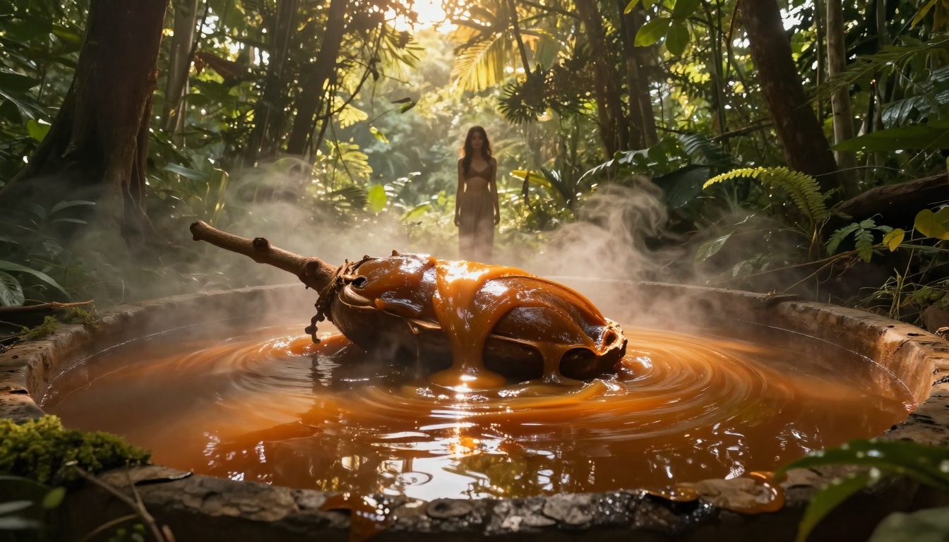 A serene jungle scene featuring a giant tamarind and a woman diving into its glossy nectar under warm sunlight.