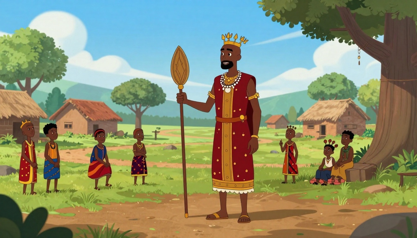 An animated short featuring Rugamba, the forest king, visiting villagers in a vibrant rural setting.