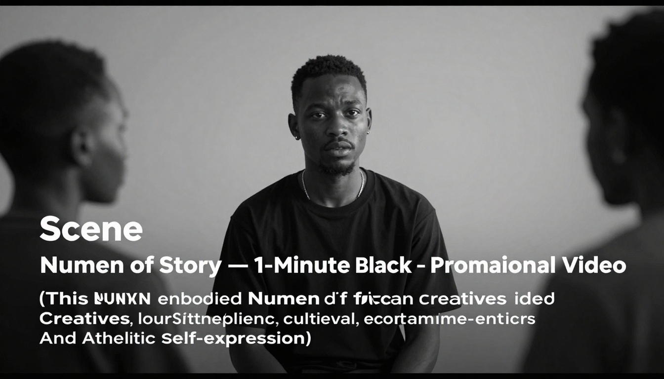 toneNumen of Story — 1-Minute Black & White Promotional Video, This video embodies Numen of Story’s purpose under NUMXN — empowering African creatives through artistic storytelling, cultural awareness, and authentic self-expression. The monochrome theme reflects introspection, depth, and creative purity while maintaining NUMXN’s aesthetic integrity., {"format":"MP4","resolution":"1080p (Full HD)","frame_rate":30,"platform_versions":[{"platform":"YouTube","aspect_ratio":"16:9"},{"platform":"Instagram","aspect_ratio":"1:1"},{"platform":"TikTok","aspect_ratio":"9:16"}]}, {"tone":"calm, reflective, articulate","gender":"neutral (preferably African English accent)","pace":"medium-slow to emphasize emotion"}descriptionBlack screen fading into the Numen of Story logo in white minimalist font. Subtle grain texture in the background for depth. | Black-and-white slow-motion clips of African creatives: a writer typing, an artist sketching, a dancer moving gracefully. | Footage of a community workshop — blurred background of participants listening, close-up of someone speaking passionately. | A slow pan across open notebooks, cameras, and microphones — the tools of storytelling. | Monochrome images of storytellers performing, poets reciting, and visual artists showcasing work under a spotlight. | Dynamic black-and-white collage: faces, pages turning, art installations, and digital screens showing Numen of Story’s online journal. | Fade into hands raised in applause; overlay the NUMXN and Numen of Story logos side by side. | Minimalist black background with white logo and website text centered.