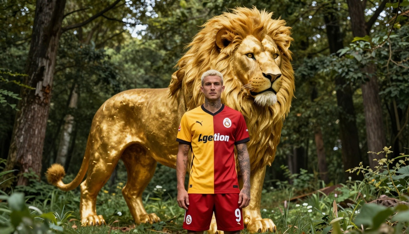 A professional football player interacts with a hyper-realistic lion in a sunlit forest, creating a serene cinematic moment.