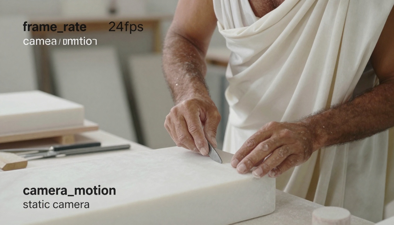 A close-up of a sculptor's hands shaping marble in a warm-toned, relaxed workshop scene.
