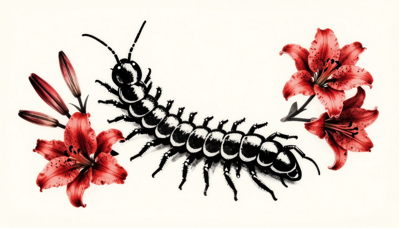 A stencil design featuring a centipede entwined with vibrant red lilies.