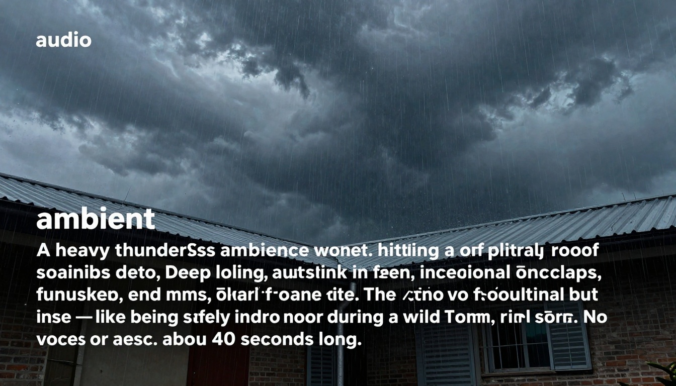 Creates an immersive audio experience of a heavy thunderstorm with rain and thunder sounds for 40 seconds.