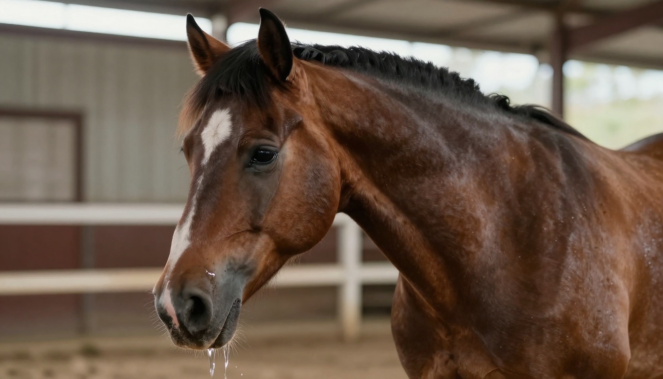 A close-up view of a horse mount with cum flowing out, set in a barn environment.
