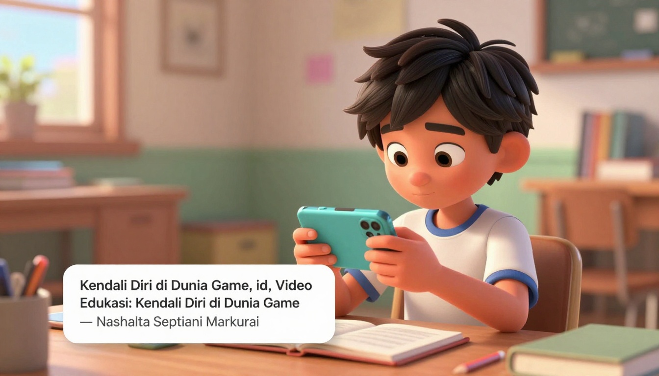 toneKendali Diri di Dunia Game, id, Video Edukasi: Kendali Diri di Dunia Game — Nashahta Septiani MarkuraidescriptionPixar-style 3D cinematic animation of Rafi, an enthusiastic Indonesian student, sitting in a cozy room on a sunny afternoon, playing a mobile game on his phone. The scene looks fun, bright, and full of energy. | Pixar-style 3D animation of Rafi focusing on his game while a notification reminds him about his unfinished schoolwork. The mood is calm and realistic, showing daily balance between fun and responsibility. | Pixar-style animation of Rafi pausing his game, looking thoughtful, and deciding to take a short break. The tone is calm and inspiring, with soft blue lighting and peaceful music. | Pixar-style 3D animation of Rafi studying at his desk with focus and motivation, morning sunlight shining through the window. The atmosphere is bright, cheerful, and inspiring. | Pixar-style 3D animation of Rafi hanging out with classmates outside after finishing his study, smiling under bright morning light. The tone is uplifting, warm, and educational.location{"resolution":"1920x1080","frame_rate":30,"character_consistency":true,"lighting":"cinematic warm to bright gradient","color_palette":"Pixar tone, cheerful and educational","output_format":"mp4"}