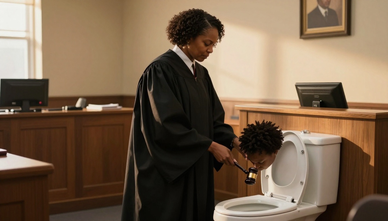 A middle-aged woman judge delivers a verdict in a warm-lit courtroom, ending in a surprising action.