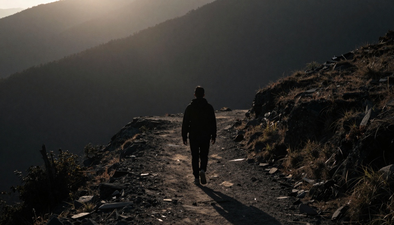 A silhouette walking on a misty mountain trail at sunrise, capturing a calm and inspirational mood with cinematic visuals.