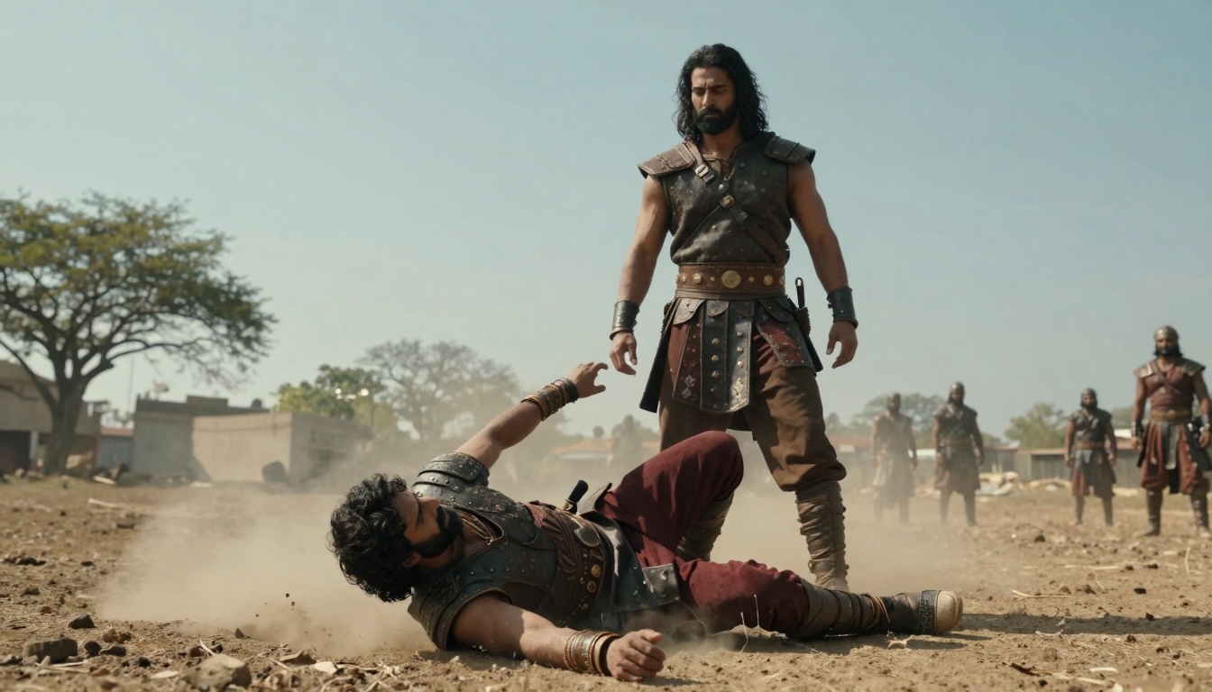 A cinematic depiction of Karna on a dramatic battlefield, showcasing his dignified stance and emotional impact.