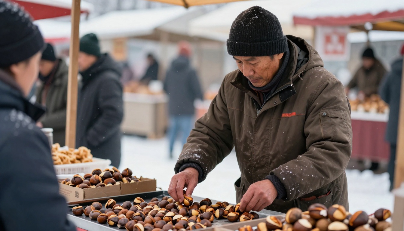 A cozy winter market scene featuring a vendor roasting chestnuts in the snow, captured in warm tones and slow-motion.