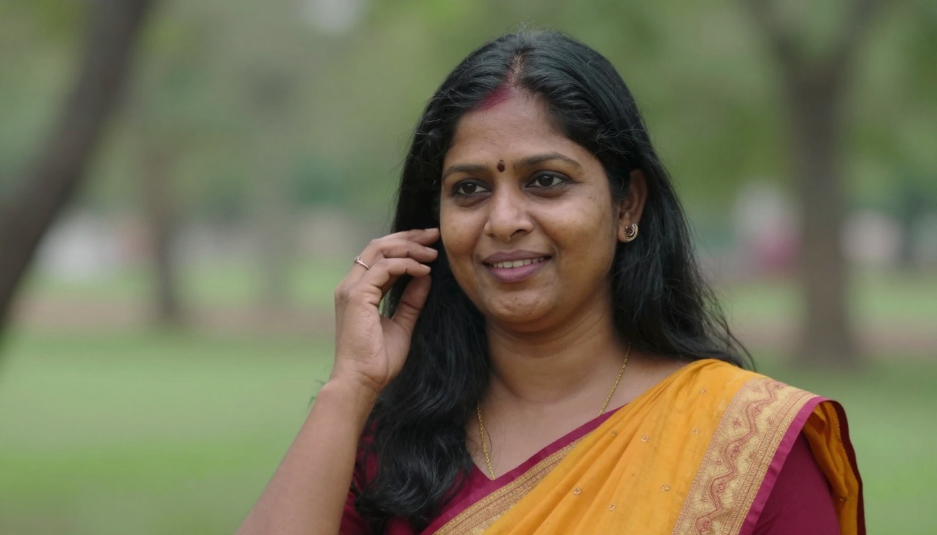 A medium close-up of a woman in a saree, capturing an intimate moment in a sunny park setting.