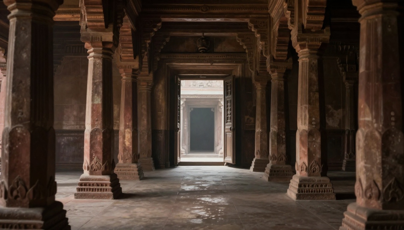 A cinematic journey through a dimly lit corridor in an ancient Indian temple with stylized realism.