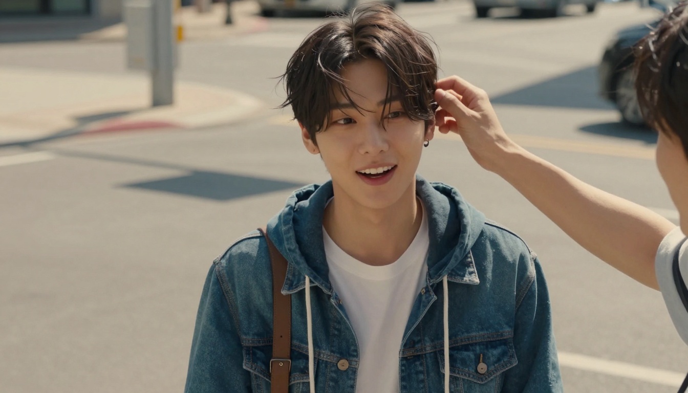 A cozy, real-life vlog-style scene of Jake Enhypen in a city street, capturing a warm, relaxed moment.
