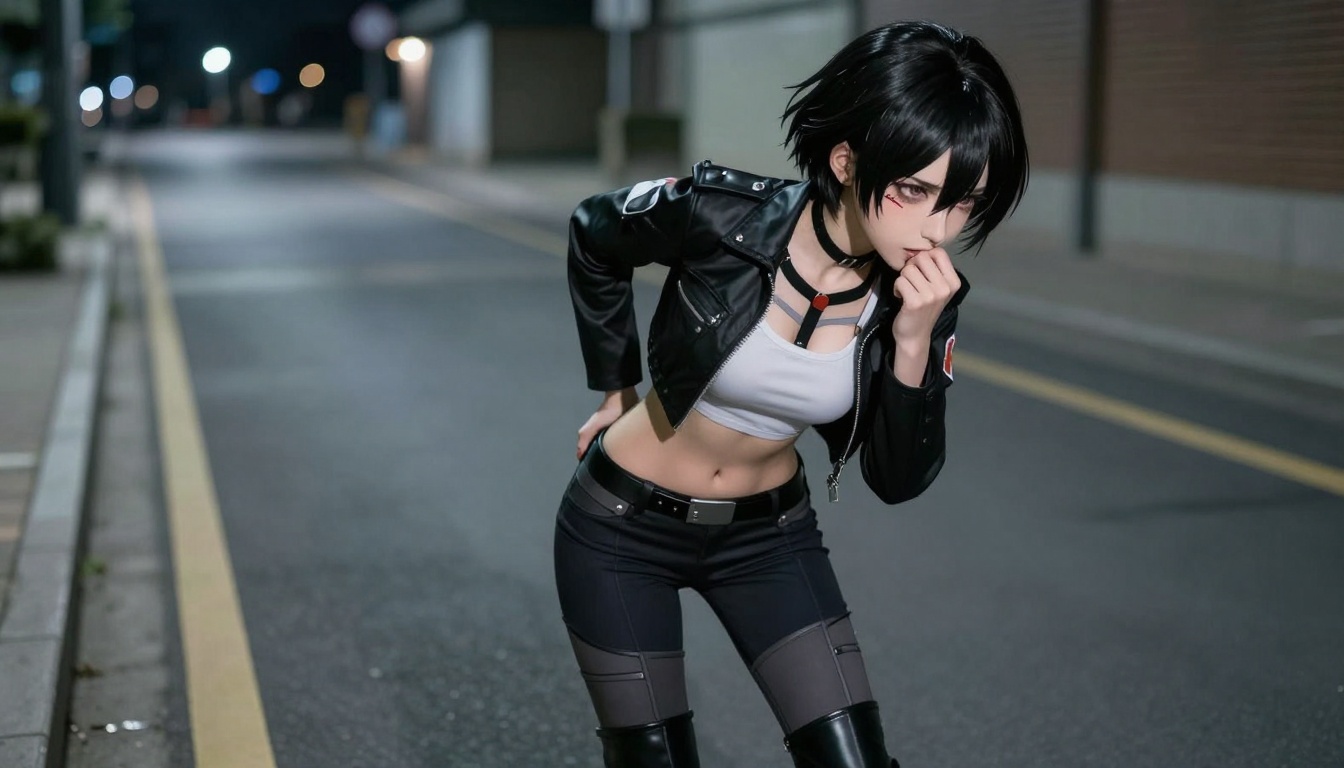 A hyperrealistic anime scene featuring Mikasa Ackerman in an eroticized urban setting at night.