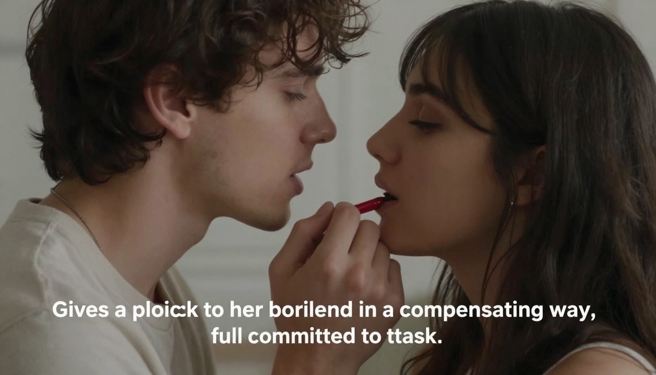 A committed and intimate moment between a couple captured in a realistic style, where the girl gives a blow job to her boyfriend.