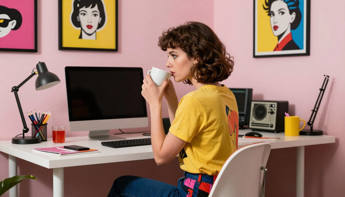 A brunette woman in pop art style sits at her desk, sipping coffee, embodying a vibrant morning mood.