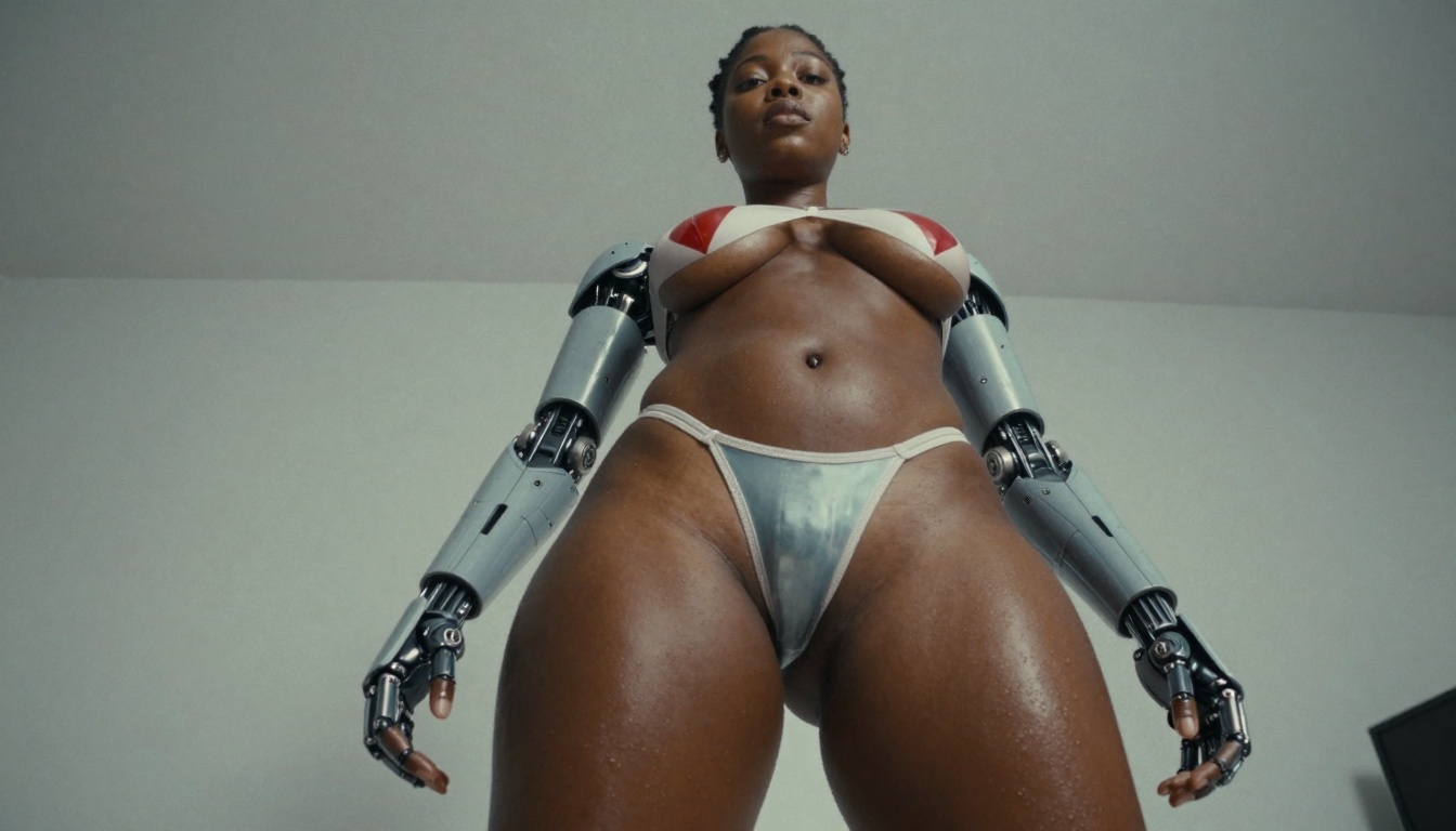 A low angle shot of a female robot in a pinup pose, showcasing exaggerated features and a dramatic aesthetic.