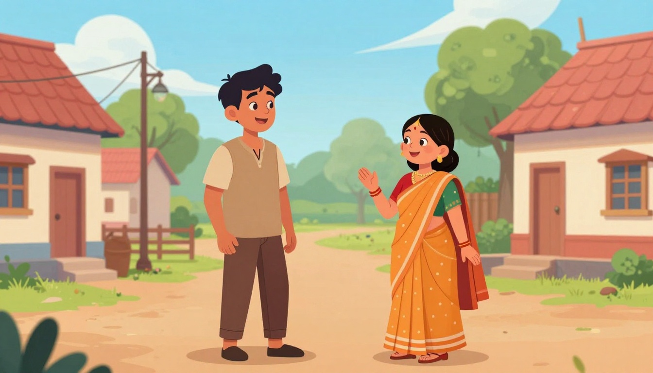 A vibrant cartoon-style scene of a happy husband and wife talking in a cheerful Indian village setting.