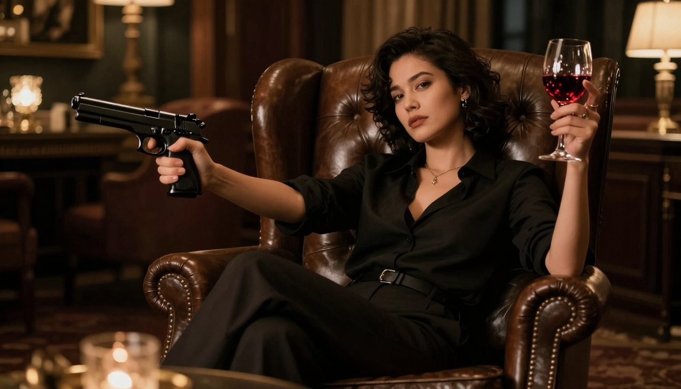 A stylish character lounges in a dimly lit lounge, exuding a tense, seductive mood with a pistol and wine glass.
