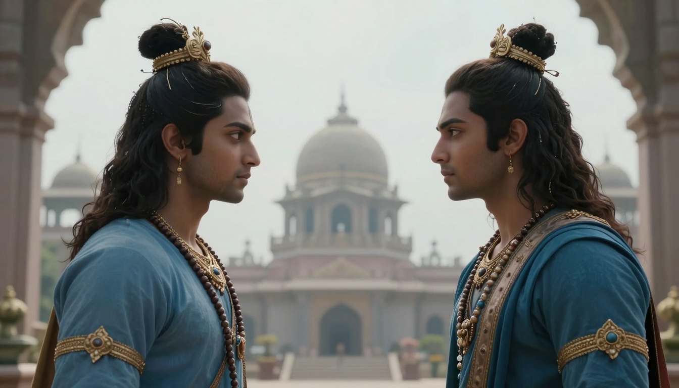 An epic scene depicting Lord Rama and Lord Parashurama in a tense, mythological standoff within a grand ancient court.