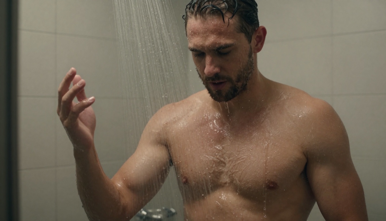 A cinematic video capturing a confident male in a steamy shower, focusing on intimate gestures and warm lighting.