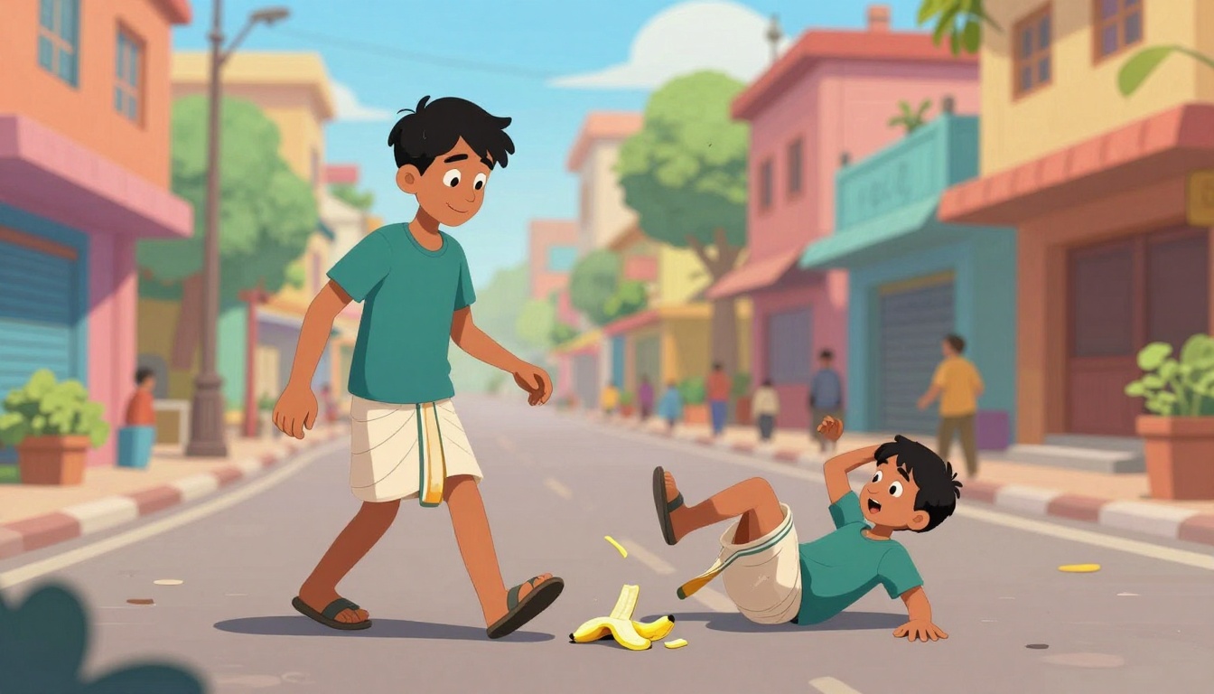 A young man comically slips on a banana peel in a vibrant cartoon street setting, showcasing exaggerated humor.