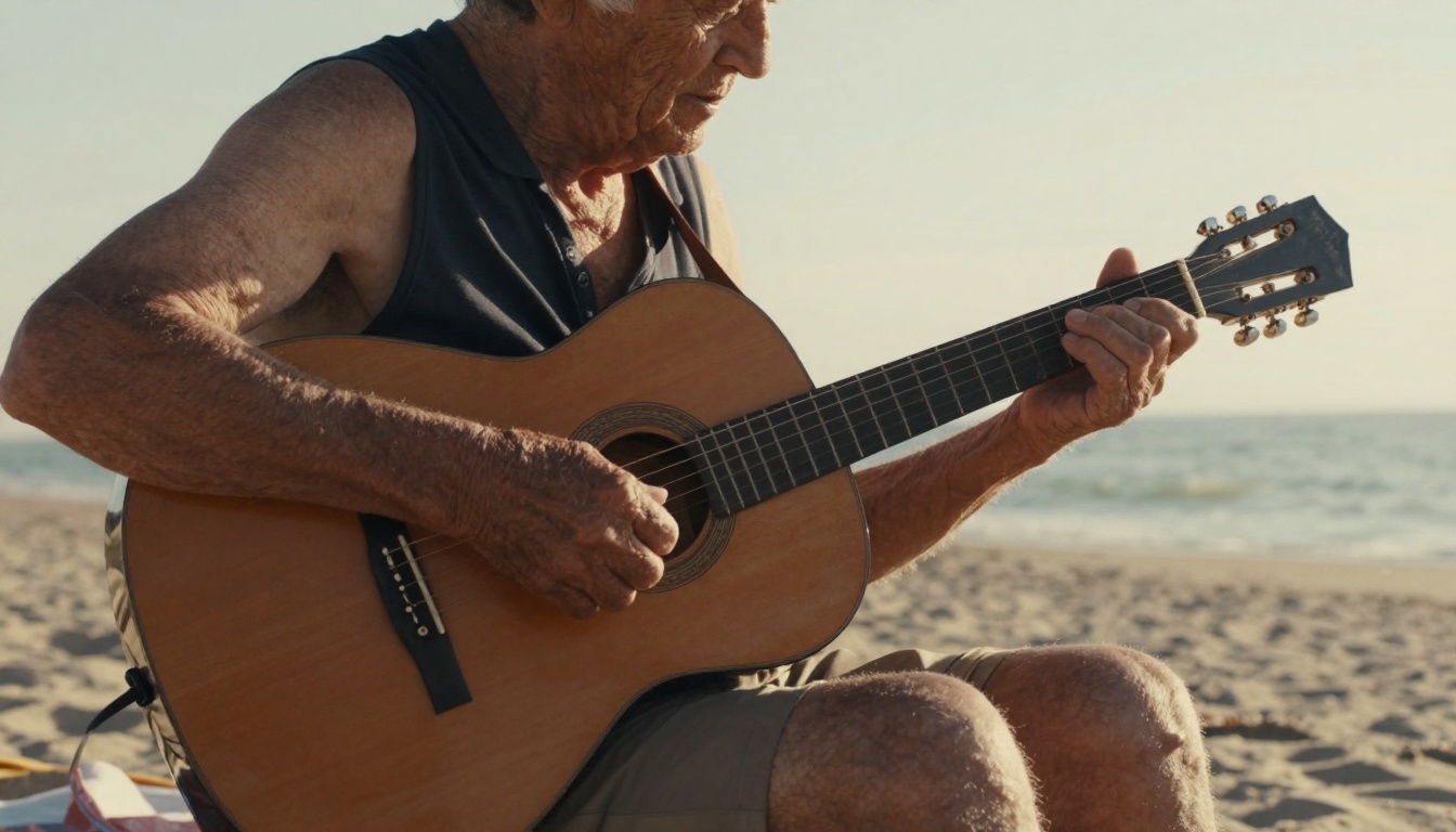 A cozy scene of an elderly person playing guitar on the beach, capturing warm sunlight and ocean sounds.
