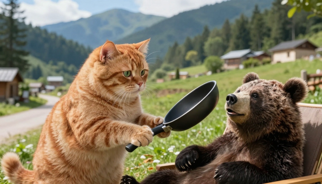 A fun 3D animated scene of a fat red cat playfully hitting a bear in a cozy mountain forest.