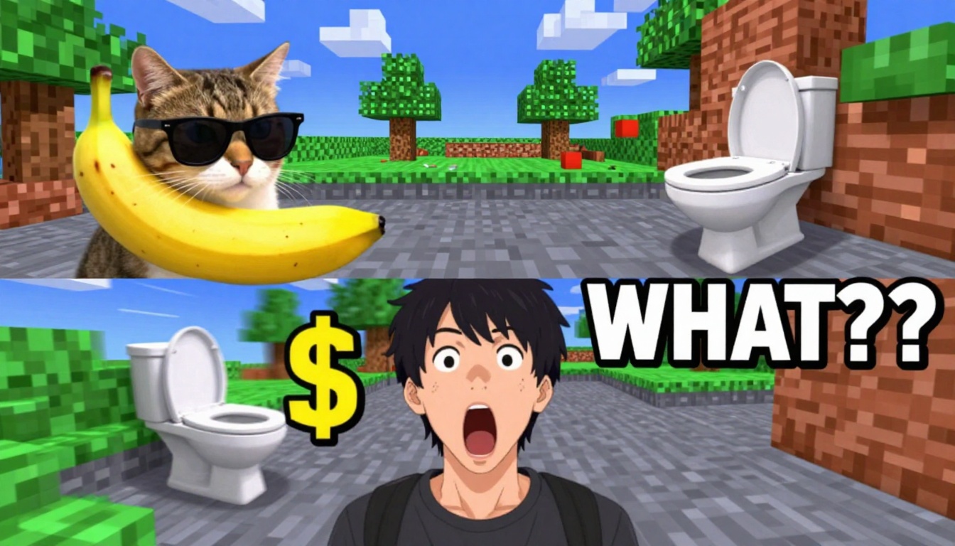 A rapid-fire, absurd video featuring a cat, memes, and chaotic visuals with loud sounds and abrupt cuts.