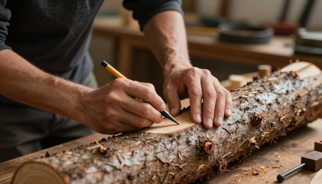 locationPrimary setting: Artisan workshop / small woodworking studio. Details: Wooden tables, scattered tools, logs of wood, chisels, saws. Background slightly cluttered but cinematic. Sunlight coming through dusty windows, creating warm highlights and soft shadows.time of dayIdeal: Morning to early afternoon — sunlight is soft and warm. Effect: Dust particles in sunlight become visible, creating cinematic rays. Optional: Golden hour lighting for extra warmth and drama.lightingType: Natural sunlight through workshop windows (soft, volumetric light). Secondary: Ambient fill light from inside workshop to reduce harsh shadows. Highlights: Focused on hands, log, and markings for cinematic emphasis. Shadows: Soft, moody, adds depth and realism.toneWarm, earthy, artisanal feel. Calm, focused, cinematic storytelling style. Slightly nostalgic and immersive, emphasizing craftsmanship. Color palette: Browns, ambers, muted greens, soft sunlight glow.