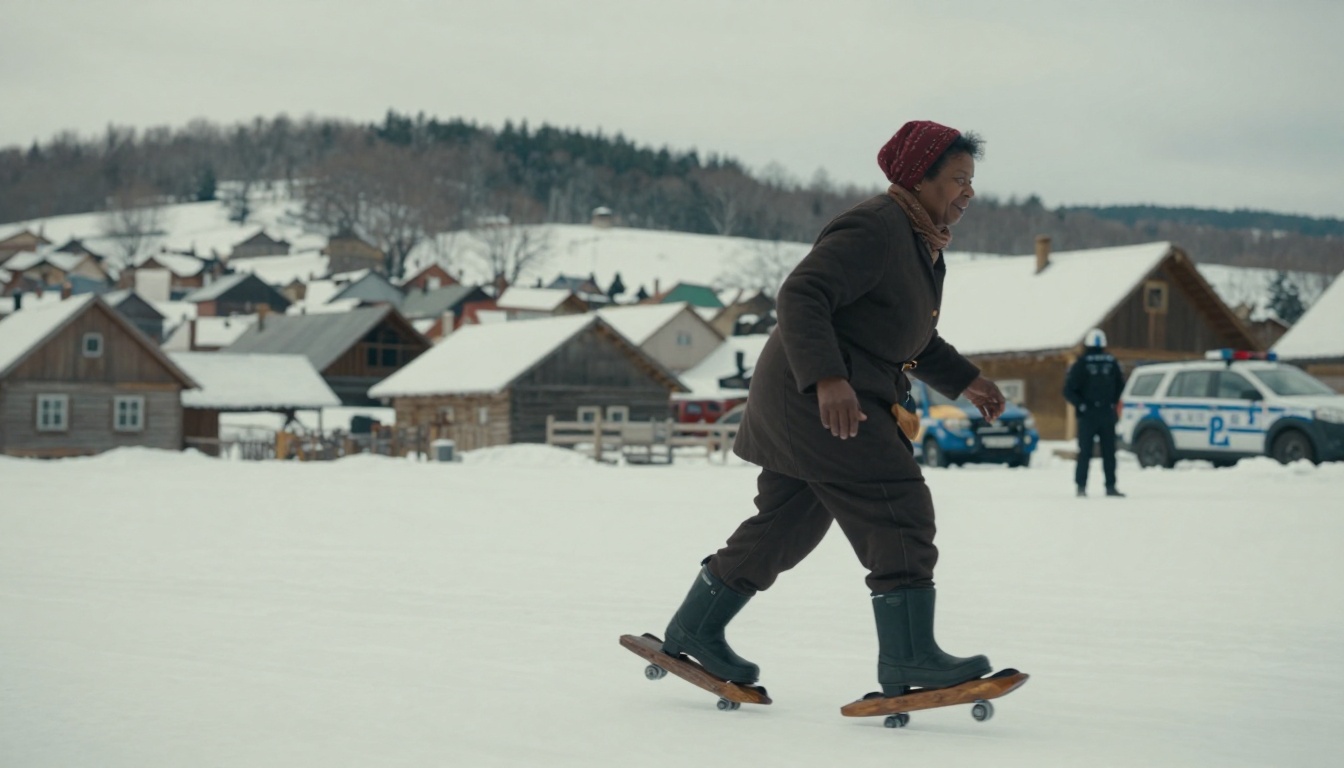 A humorous scene of an old lady zipping through a snowy village on rocket boots, pursued by police.