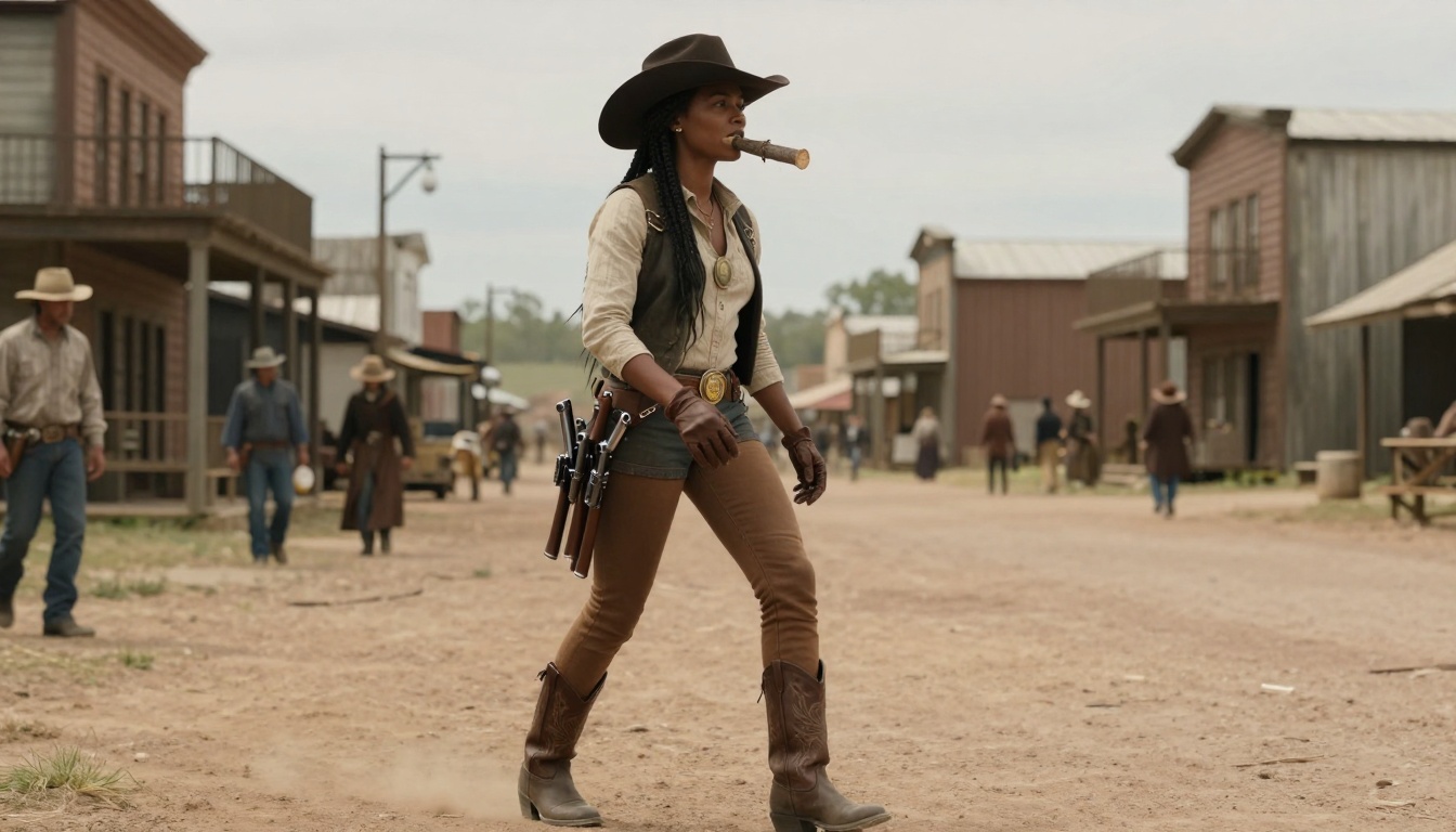 A tense scene of a black woman bounty hunter scanning her surroundings in a bustling old west town at high noon.