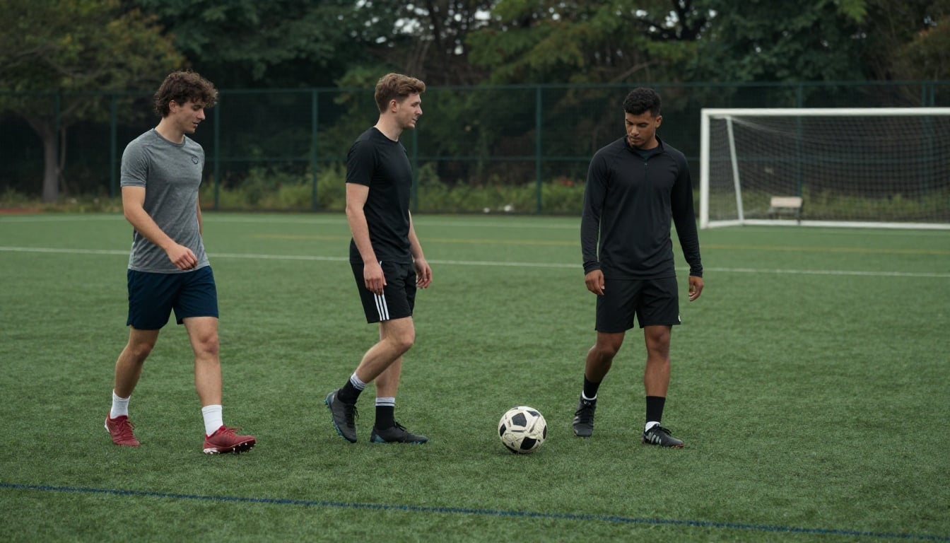 A cinematic shot of football players warming up on a grass field, captured in sharp focus with smooth camera motion.