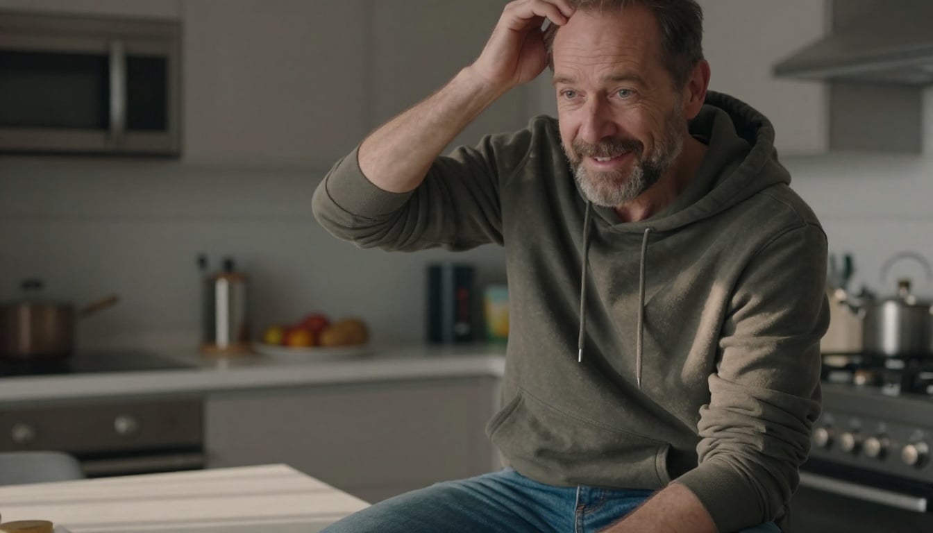 A medium close-up of a smiling man in a kitchen, gently rubbing his head in soft, golden hour light.