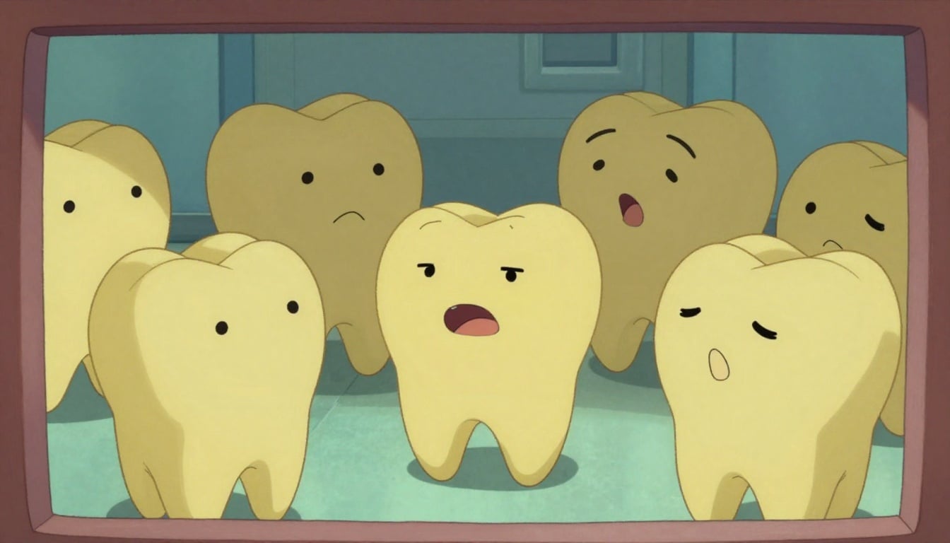 A humorous animated scene inside a mouth featuring talking teeth characters expressing emotions.