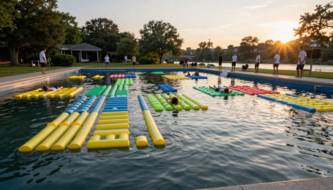 A serene aerial shot of brightly colored pool noodle segments floating in the Grand River at sunset.