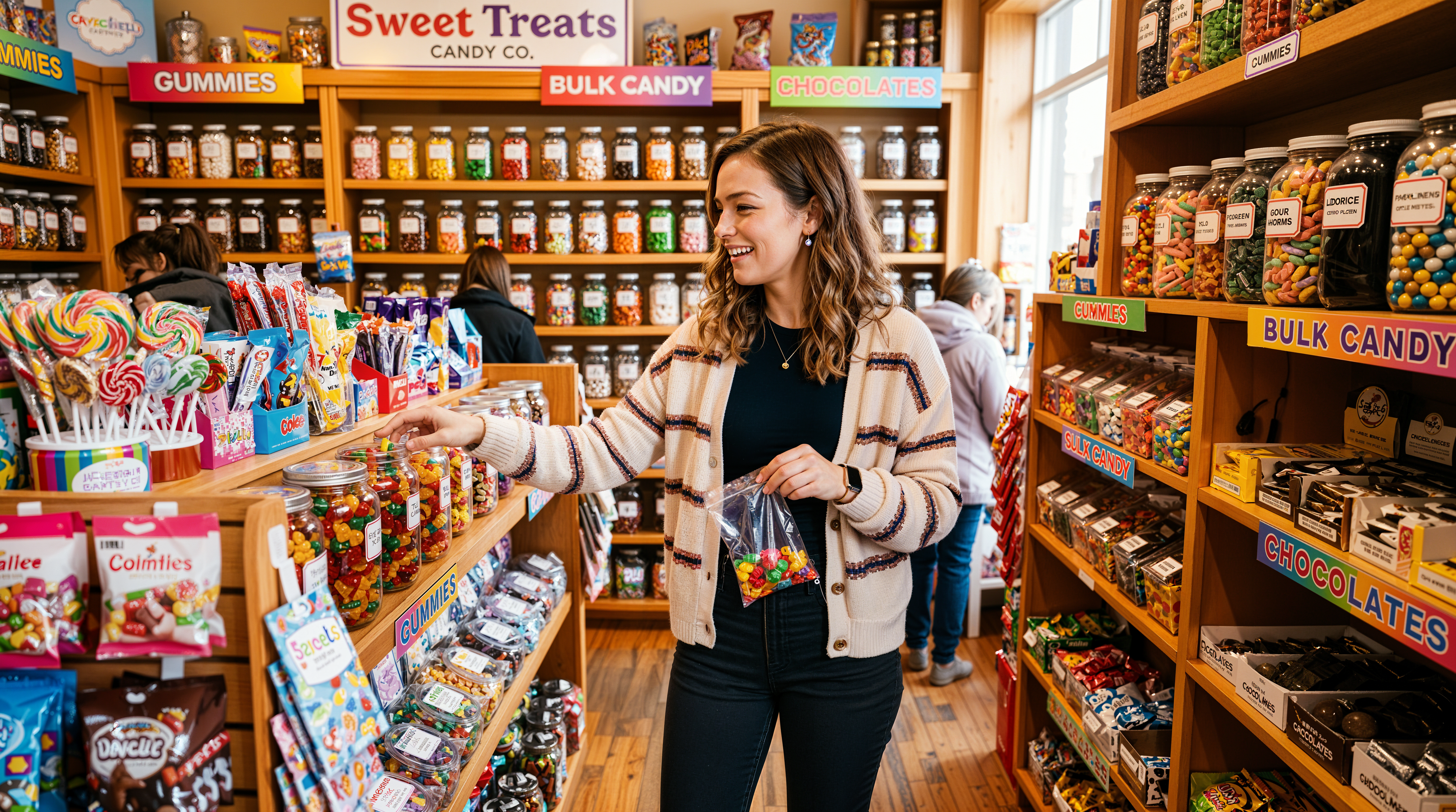a thrilling action sequence of a woman trying to find her favorite candy. The candy wrapper is purple with a pixelated dragon and reads "Pixel Dojo". The woman says "Gotta have that pixel dojo candy. with over 60 ai tools, it's basically zero calories."