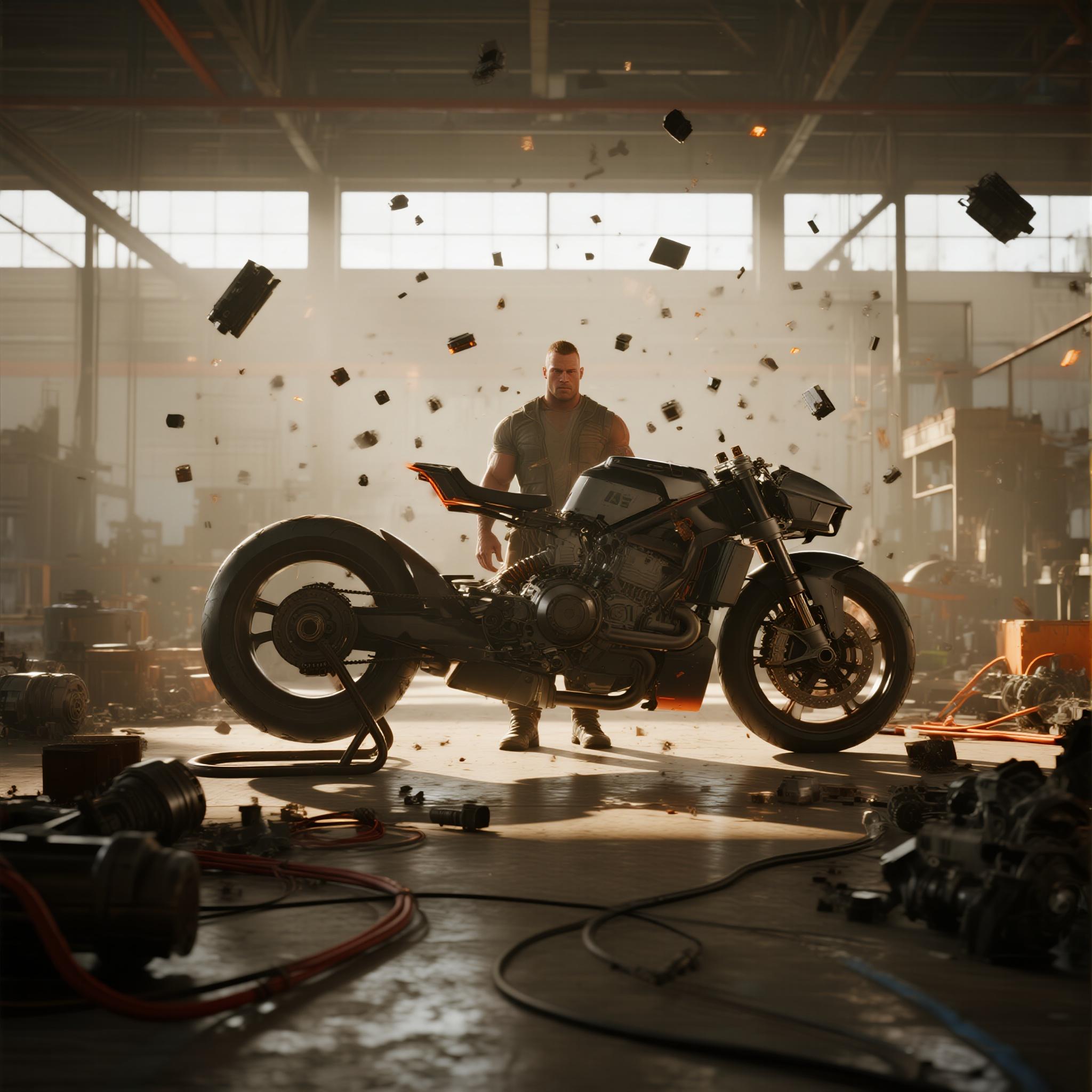 { "shot": { "composition": "wide shot centered at eye level, capturing the full view of the factory floor and the assembling motorbike", "lens": "35mm", "frame_rate": "24fps", "camera_movement": "static" }, "subject": { "description": "a futuristic, strong motorbike assembling itself from scattered parts", "wardrobe": "", "props": "mechanical parts, gears, wires, pistons, body panels, wheels" }, "scene": { "location": "large, clear industrial factory floor", "time_of_day": "midday", "environment": "shiny, clean surfaces with strong light and dramatic shadows; the atmosphere is warm and filled with subtle ambient haze" }, "visual_details": { "action": "motorbike parts fly in from all directions, clicking and locking into place to form a complete, sleek vehicle", "special_effects": "electric zaps, soft glows, heat distortion waves rising from the exhaust", "hair_clothing_motion": "" }, "cinematography": { "lighting": "bright overhead industrial lighting with sharp contrast, emphasizing form and texture", "color_palette": "warm tones with metallic highlights and soft amber reflections", "tone": "epic and intense, emphasizing mechanical precision and power" }, "audio": { "music": "minimalist, deep synthetic pulses that build with the assembly", "ambient": "deep factory hum, subtle air movements", "sound_effects": "clicks, whirs, zaps, shinks, thuds, whooshes, crackles, hiss, rumble", "mix_level": "cinematic mix with prioritized effects and balanced music bed" }, "dialogue": { "character": "", "line": "", "subtitles": false } }