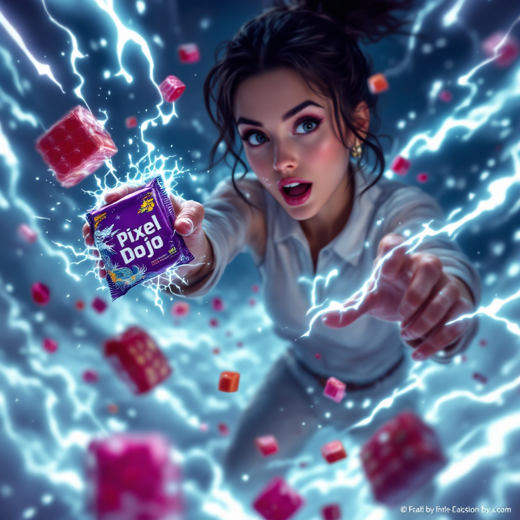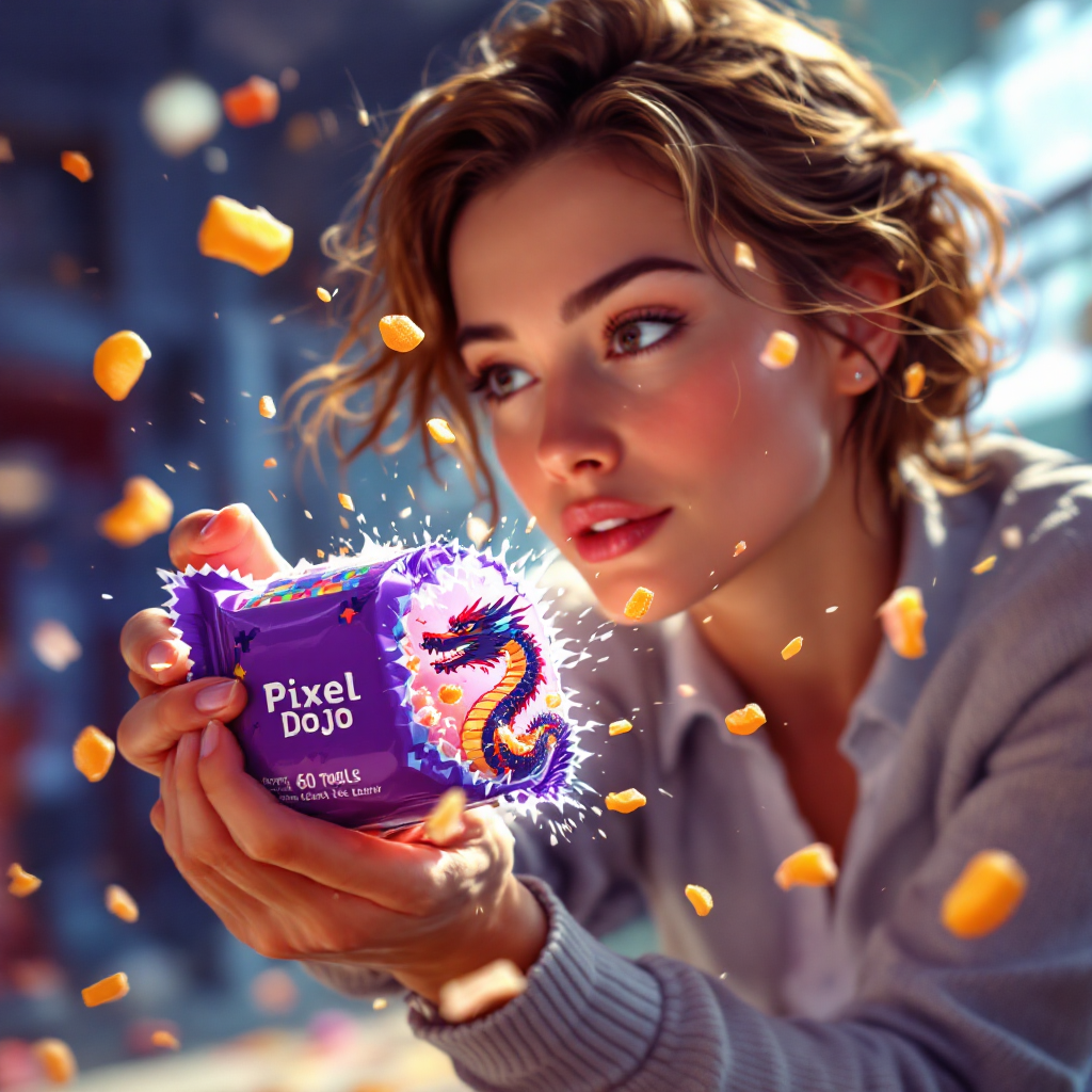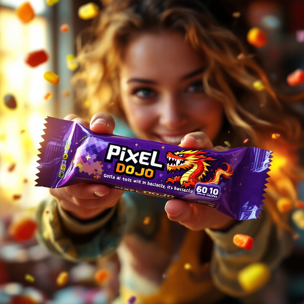 a thrilling action sequence of a woman trying to find her favorite candy. The candy wrapper is purple with a pixelated dragon and reads "Pixel Dojo". The woman says "Gotta have that pixel dojo candy. with over 60 ai tools, it's basically zero calories."
