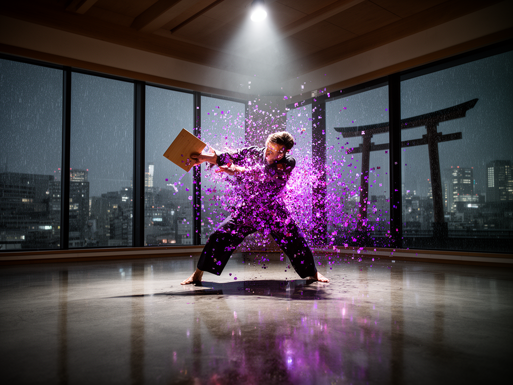 A dramatic low-angle photograph of a master martial artist mid-strike inside a sleek modern dojo, shattering a wooden board that explodes into thousands of glowing purple and pink pixel fragments that scatter through the air like embers. The dojo has polished concrete floors, floor-to-ceiling windows revealing a rain-soaked Tokyo cityscape at night, and minimal Japanese architectural details — clean wooden beams, a torii gate silhouette visible through the glass. The pixel fragments cast colored light across the fighter's face and the wet floor reflections. Shot on Sony A7R V, 35mm f/1.4, shallow depth of field, dramatic side lighting from a single overhead spotlight cutting through atmospheric haze, rain streaks visible on the windows. Hyperrealistic, editorial photography, 8K resolution