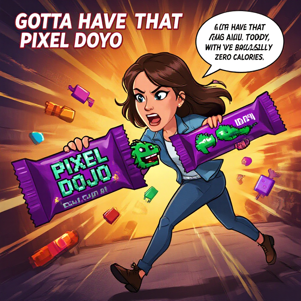 a thrilling action sequence of a woman trying to find her favorite candy. The candy wrapper is purple with a pixelated dragon and reads "Pixel Dojo". The woman says "Gotta have that pixel dojo candy. with over 60 ai tools, it's basically zero calories."