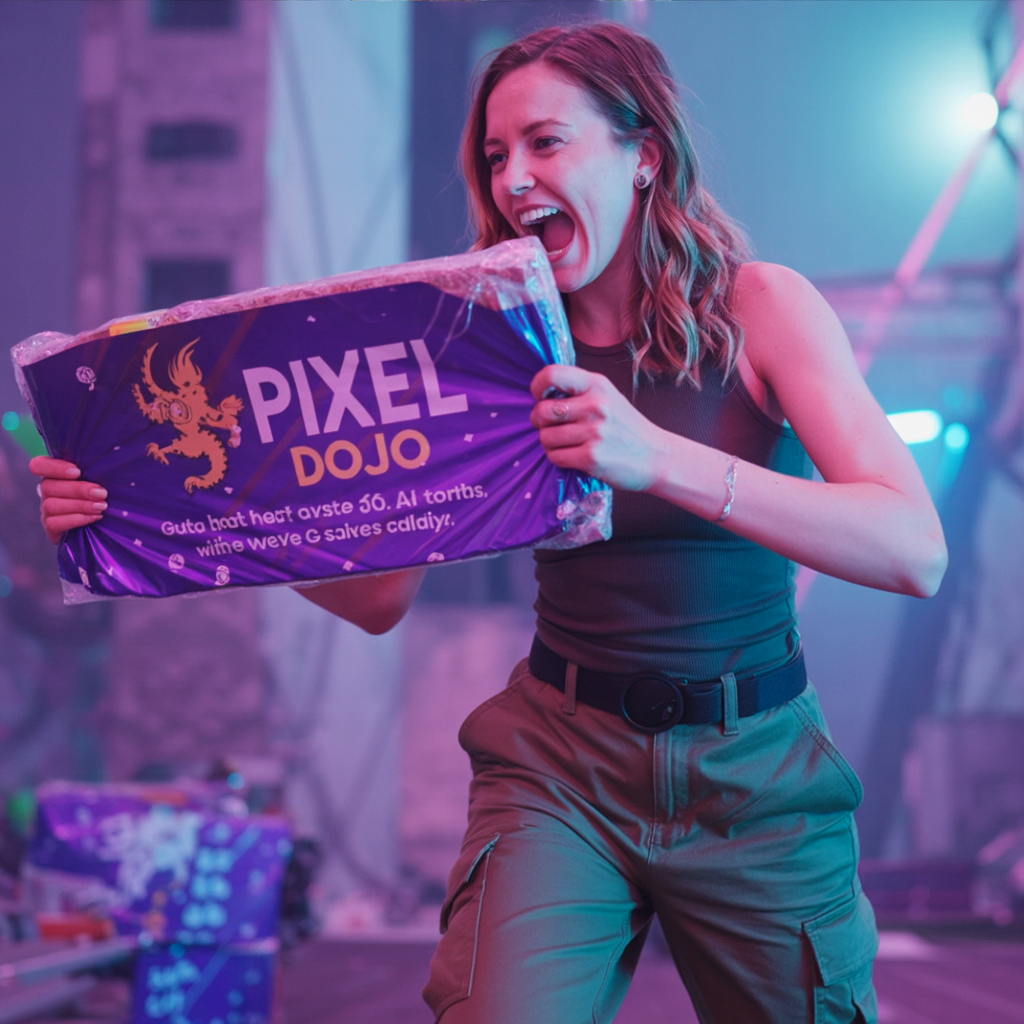 a thrilling action sequence of a woman trying to find her favorite candy. The candy wrapper is purple with a pixelated dragon and reads "Pixel Dojo". The woman says "Gotta have that pixel dojo candy. with over 60 ai tools, it's basically zero calories."