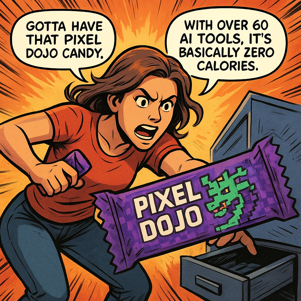 a thrilling action sequence of a woman trying to find her favorite candy. The candy wrapper is purple with a pixelated dragon and reads "Pixel Dojo". The woman says "Gotta have that pixel dojo candy. with over 60 ai tools, it's basically zero calories."