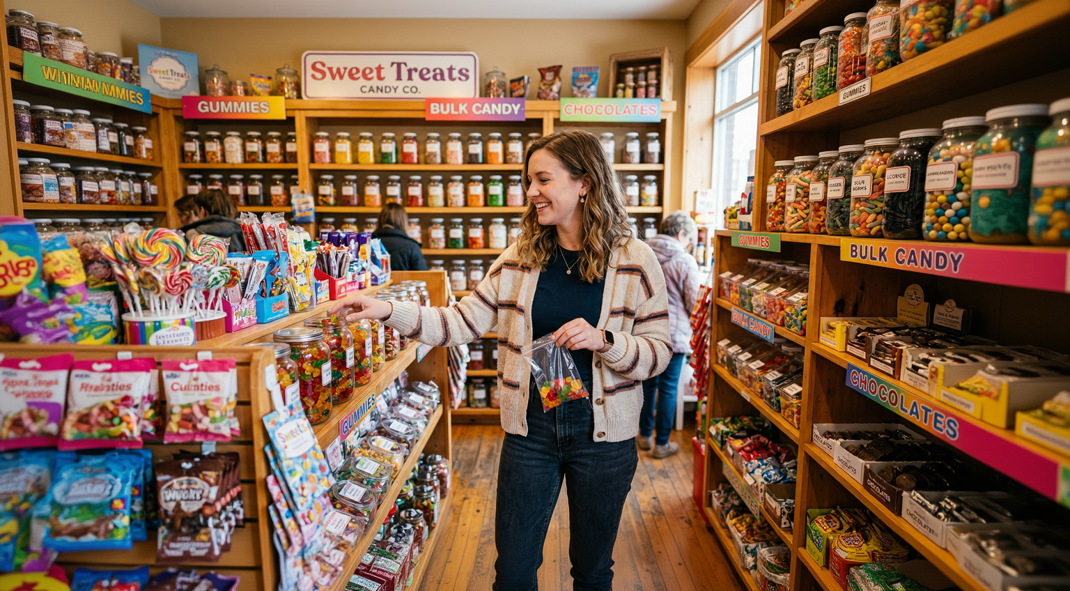 a thrilling action sequence of a woman trying to find her favorite candy. The candy wrapper is purple with a pixelated dragon and reads "Pixel Dojo". The woman says "Gotta have that pixel dojo candy. with over 60 ai tools, it's basically zero calories."