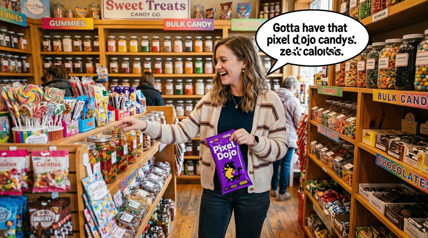 a thrilling action sequence of a woman trying to find her favorite candy. The candy wrapper is purple with a pixelated dragon and reads "Pixel Dojo". The woman says "Gotta have that pixel dojo candy. with over 60 ai tools, it's basically zero calories."
