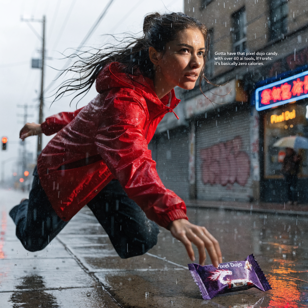 a thrilling action sequence of a woman trying to find her favorite candy. The candy wrapper is purple with a pixelated dragon and reads "Pixel Dojo". The woman says "Gotta have that pixel dojo candy. with over 60 ai tools, it's basically zero calories."