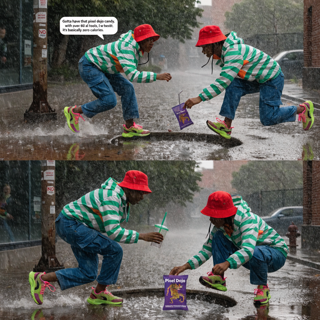 a thrilling action sequence of a woman trying to find her favorite candy. The candy wrapper is purple with a pixelated dragon and reads "Pixel Dojo". The woman says "Gotta have that pixel dojo candy. with over 60 ai tools, it's basically zero calories."