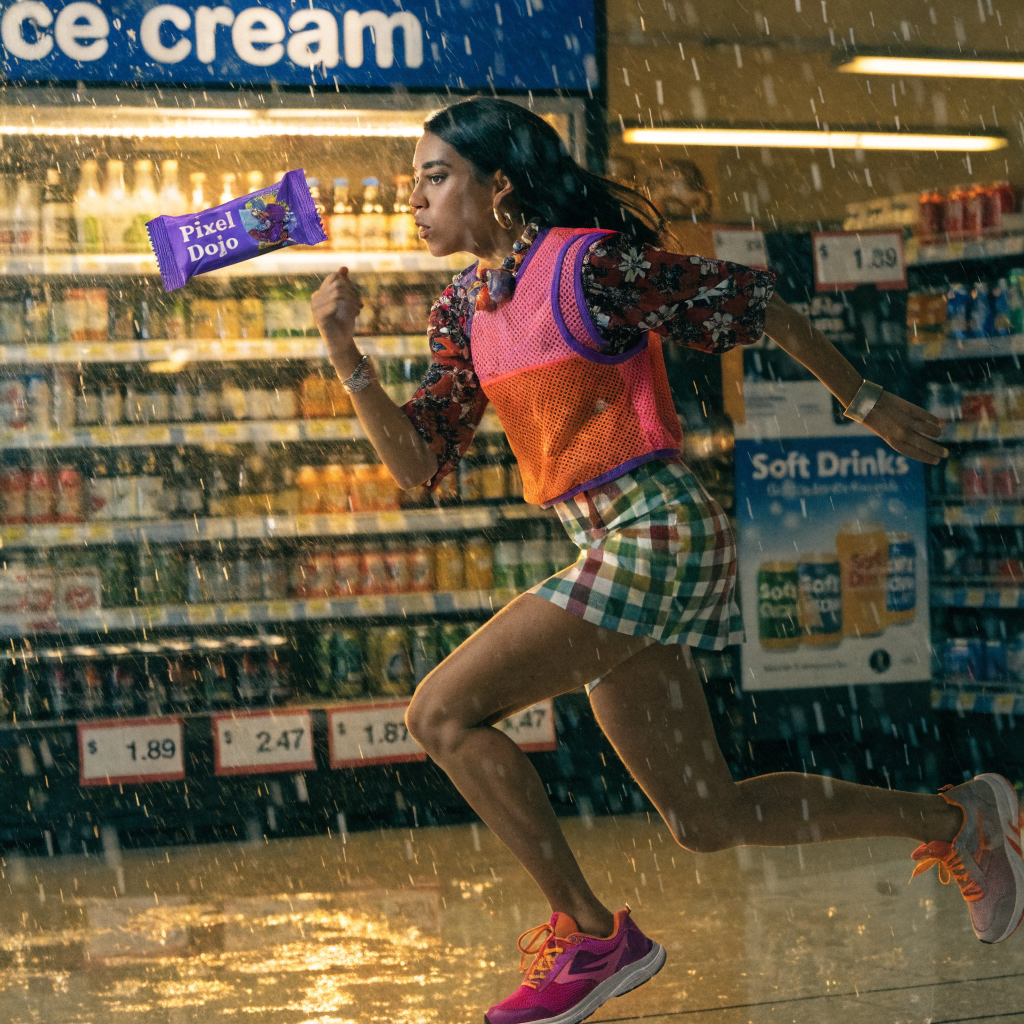 a thrilling action sequence of a woman trying to find her favorite candy. The candy wrapper is purple with a pixelated dragon and reads "Pixel Dojo". The woman says "Gotta have that pixel dojo candy. with over 60 ai tools, it's basically zero calories."