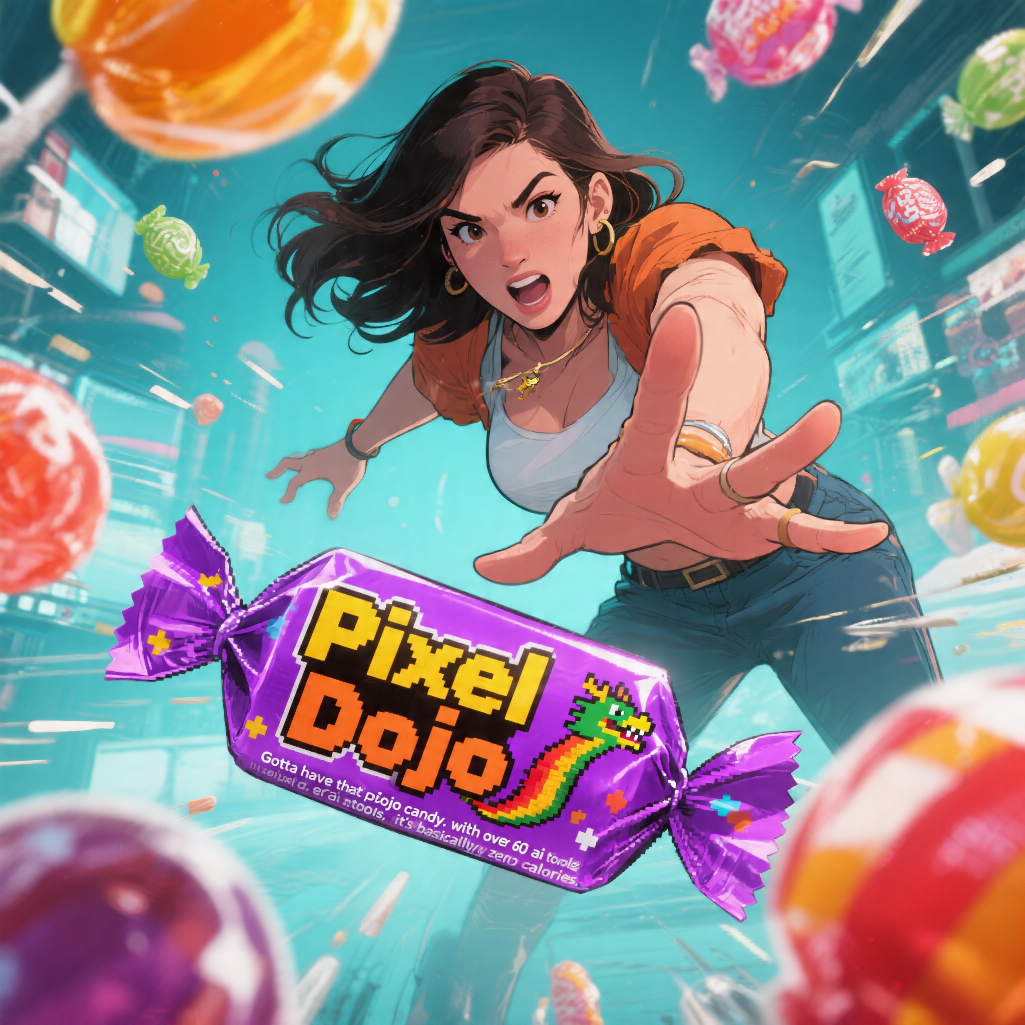 a thrilling action sequence of a woman trying to find her favorite candy. The candy wrapper is purple with a pixelated dragon and reads "Pixel Dojo". The woman says "Gotta have that pixel dojo candy. with over 60 ai tools, it's basically zero calories."