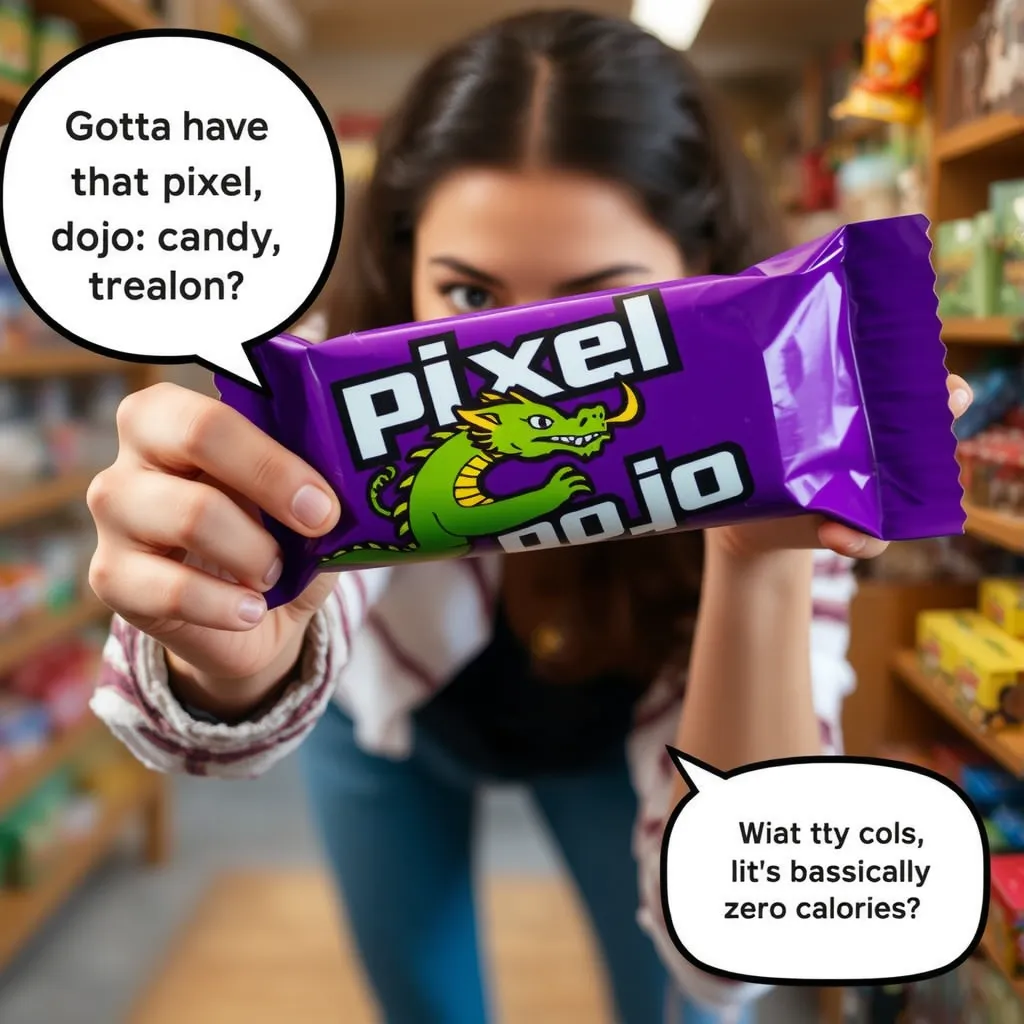 a thrilling action sequence of a woman trying to find her favorite candy. The candy wrapper is purple with a pixelated dragon and reads "Pixel Dojo". The woman says "Gotta have that pixel dojo candy. with over 60 ai tools, it's basically zero calories."