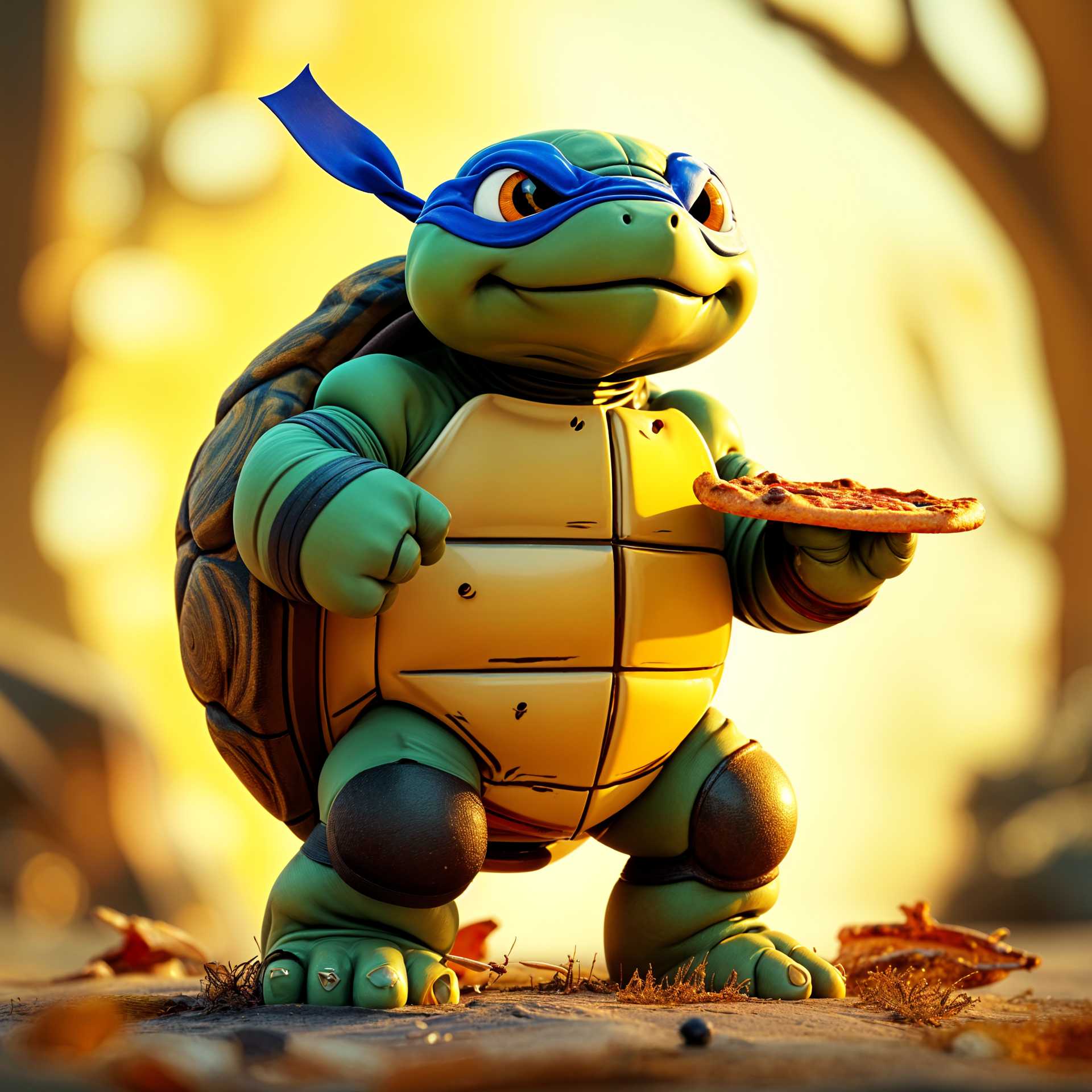 The image features a stylized, cartoonish turtle that resembles a character from the Teenage Mutant Ninja Turtles franchise. The turtle is standing upright on its hind legs, with a confident and somewhat mischievous expression. It has a large, textured shell that is a mix of brown and green, with a pattern that gives the impression of scales or wood grain. The turtle's skin is a vibrant green, and it has a muscular build, with its arms and legs appearing to be made of metal or a similar material, giving it a tough and armored appearance. The turtle is wearing a blue headband with a white 'M' on it, which is reminiscent of the 'Mutant' insignia from the Ninja Turtles. It also has a pair of black gloves and knee pads, which further emphasize its tough persona. In its right hand, the turtle is holding a pizza, which is a nod to the classic love for pizza that the Ninja Turtles are known for. The background is a soft, warm, and somewhat blurred autumnal scene with golden light filtering through the trees, giving the image a cozy and inviting atmosphere. The ground is covered in fallen leaves and twigs, and there's a sense of depth and warmth in the lighting that makes the scene feel both tranquil and dynamic. The details that make this image interesting include the playful and whimsical nature of the turtle, which is a departure from the more serious and action-oriented depictions of the Ninja Turtles. The contrast between the turtle's tough armor and the casual act of holding a pizza adds a layer of humor and charm. Additionally, the attention to texture and lighting in the image gives it a three-dimensional quality and a sense of movement, making it feel both static and alive.